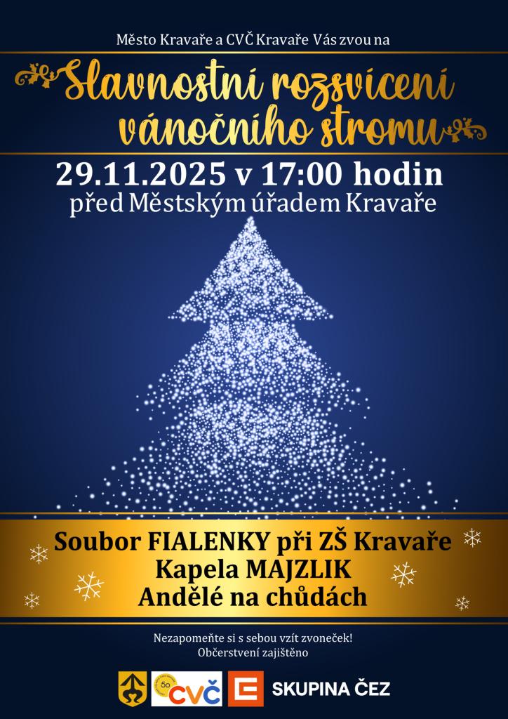 Město Kravaře a CVČ Kravaře vás zvou na Slavnostní rozsvícení vánočního stromu před městským úřadem, které se uskuteční v sobotu 29.11.2025 od 17:00 hod.