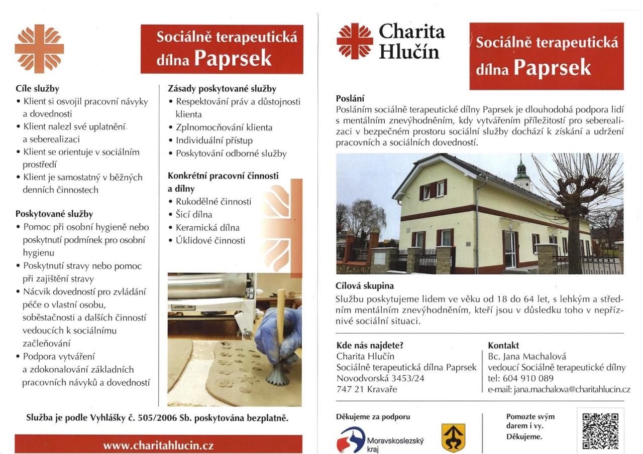 Sociálně terapeutická dílna Paprsek, provozovaná Charitou Hlučín, nabízí dlouhodobou podporu lidem s mentálním znevýhodněním. Cílem služby je poskytnout bezpečné a podnětné prostředí, kde mohou klienti rozvíjet své pracovní i sociální dovednosti. Více informací o provozu najdete v letáčku.